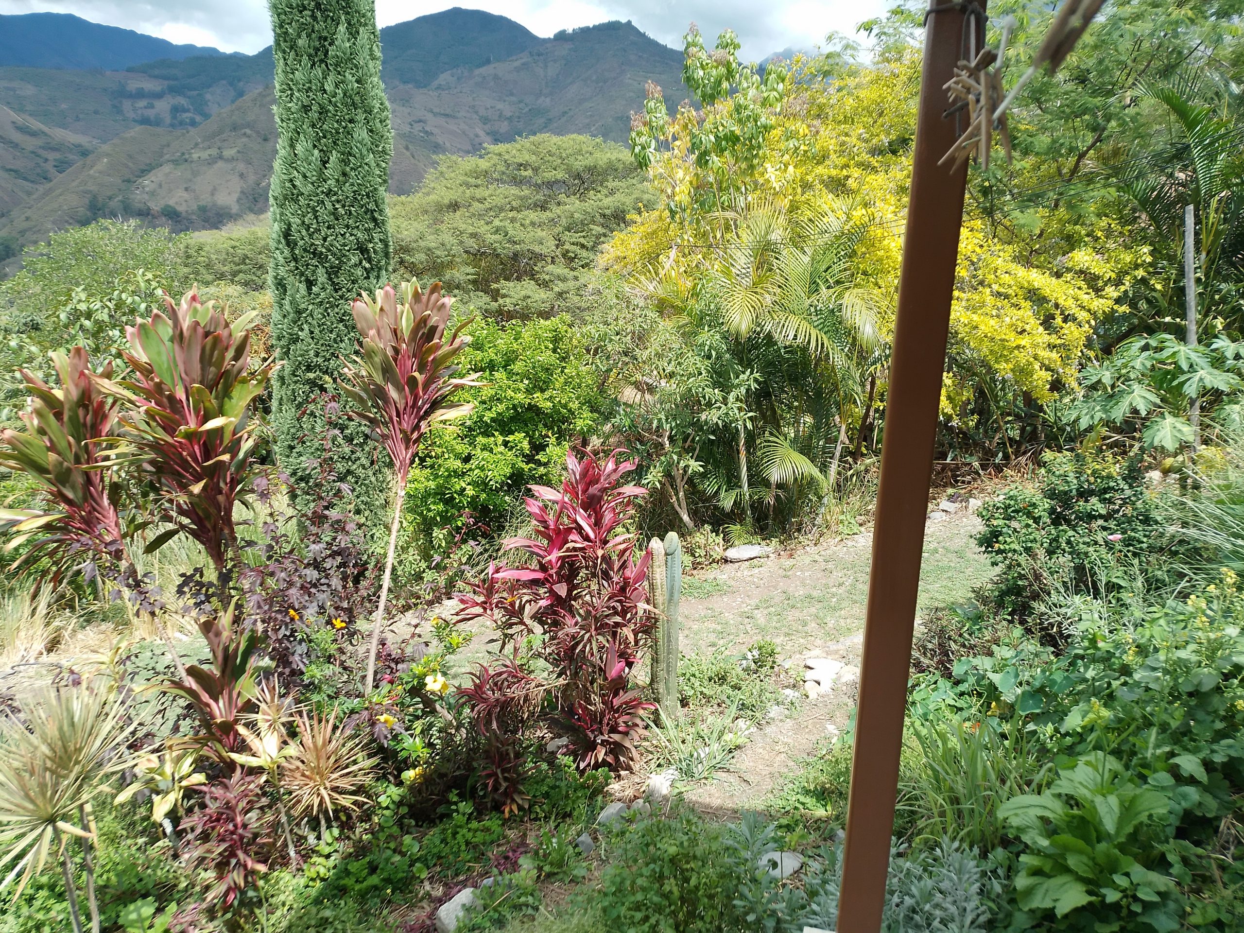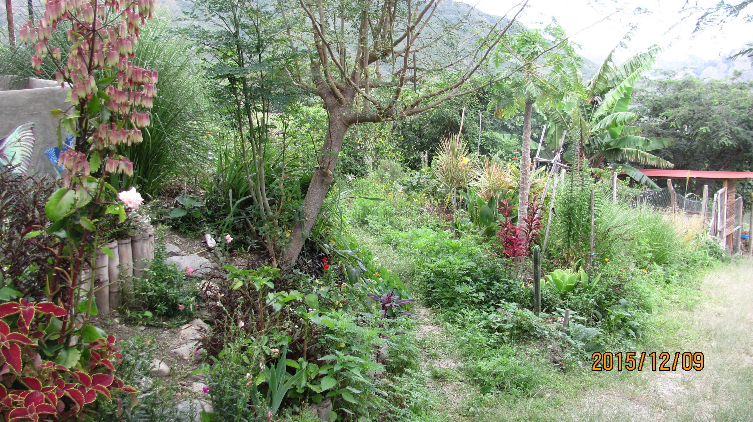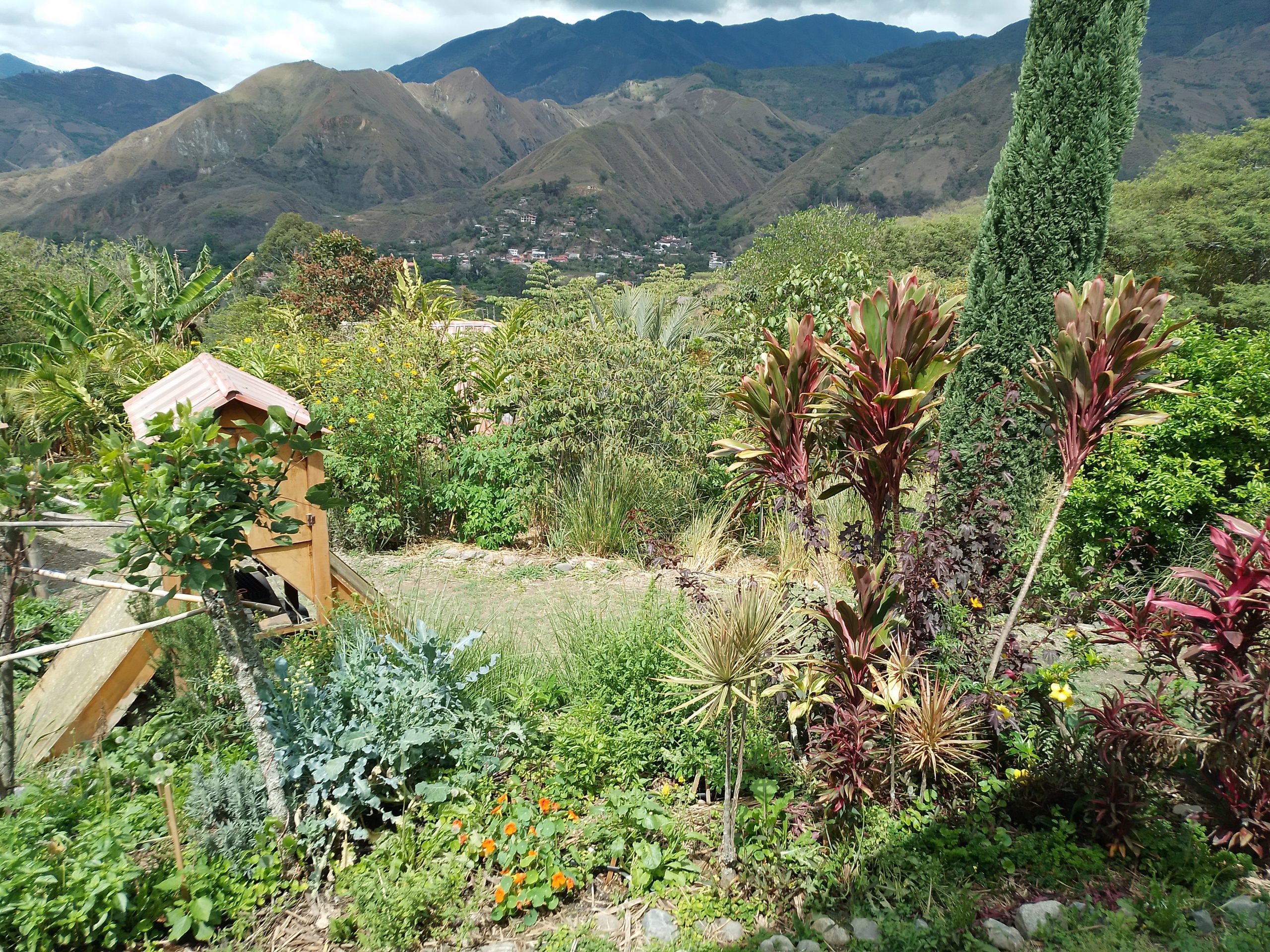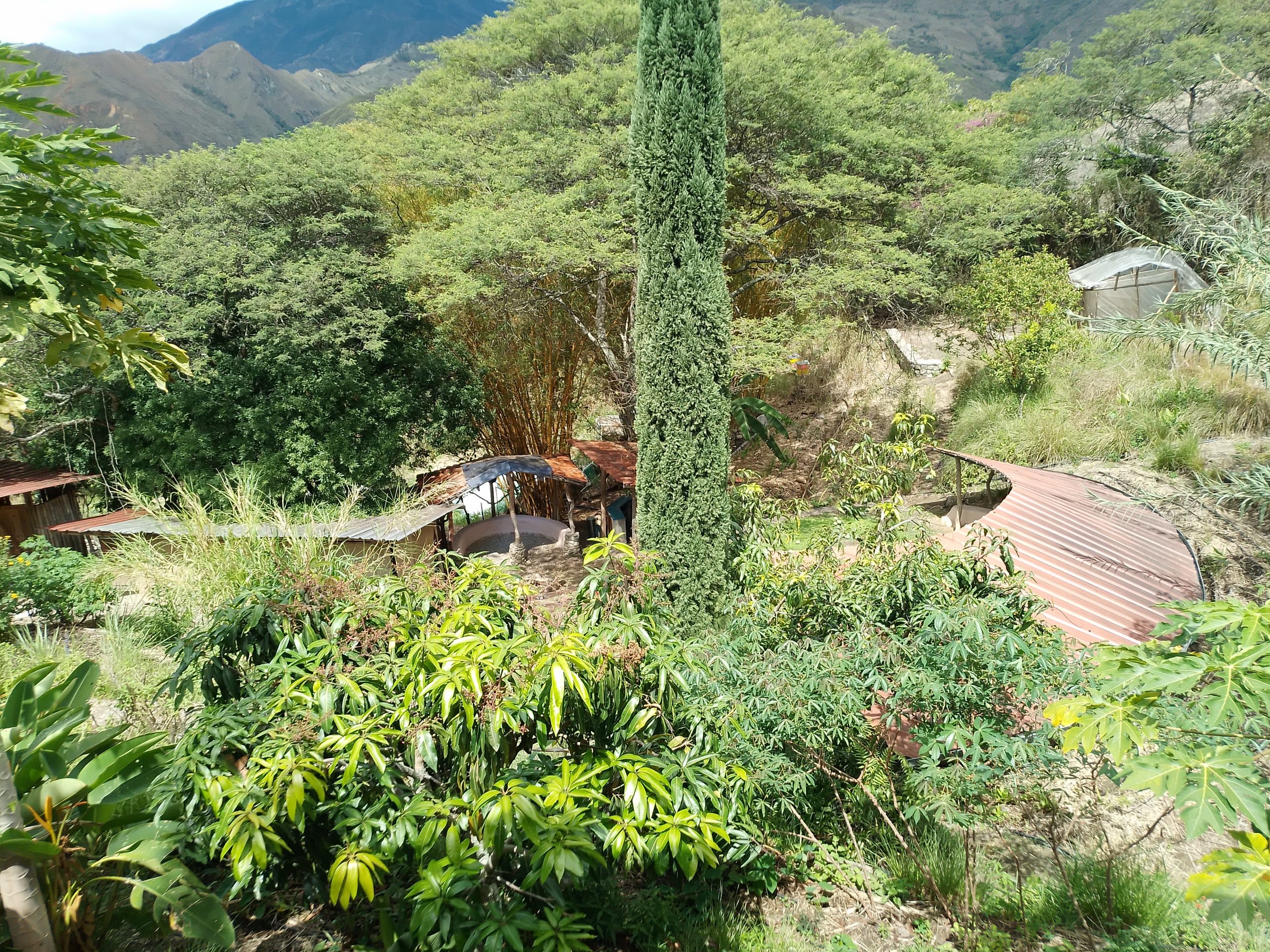 ¡Vida Verde y Yupaichani Land Share madurando! in Permaculture by Zia Parker Se está llenando de la exuberancia de la permacultura de un policultivo de varios pisos. Biodiversidad = seguridad. 1.A.green upon green 1.B.spiral.closer 1C.circles.circles-1-2048×1577 2.A.Cabaña, from above 2.B. VV.young bananas 3.Herb. chervil.VV 4.Medicinal. nettle 5. Fruit.Nispero fruit 6.chupa mangoes 7.zone 1, Below House,dozens of herbs 8.glad bowing to butterfly goddess 9.Jungle! 10.lumber tree,laurel trunk.planted 2013 11.Cauli 12. clearing pool site.2018 13.Krauts galore 14. path leading to circle 15.workshop, organic association, on cabaña deck 18.View from Bodega 19.Zone 1 with view 20.Zone 1 with view to East